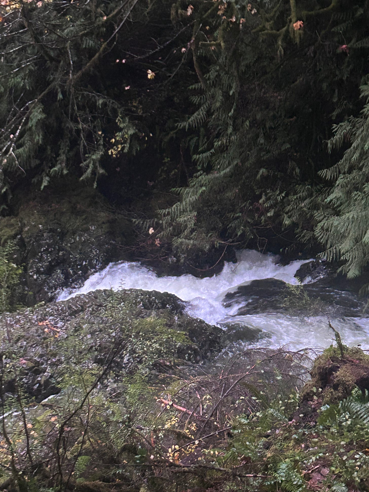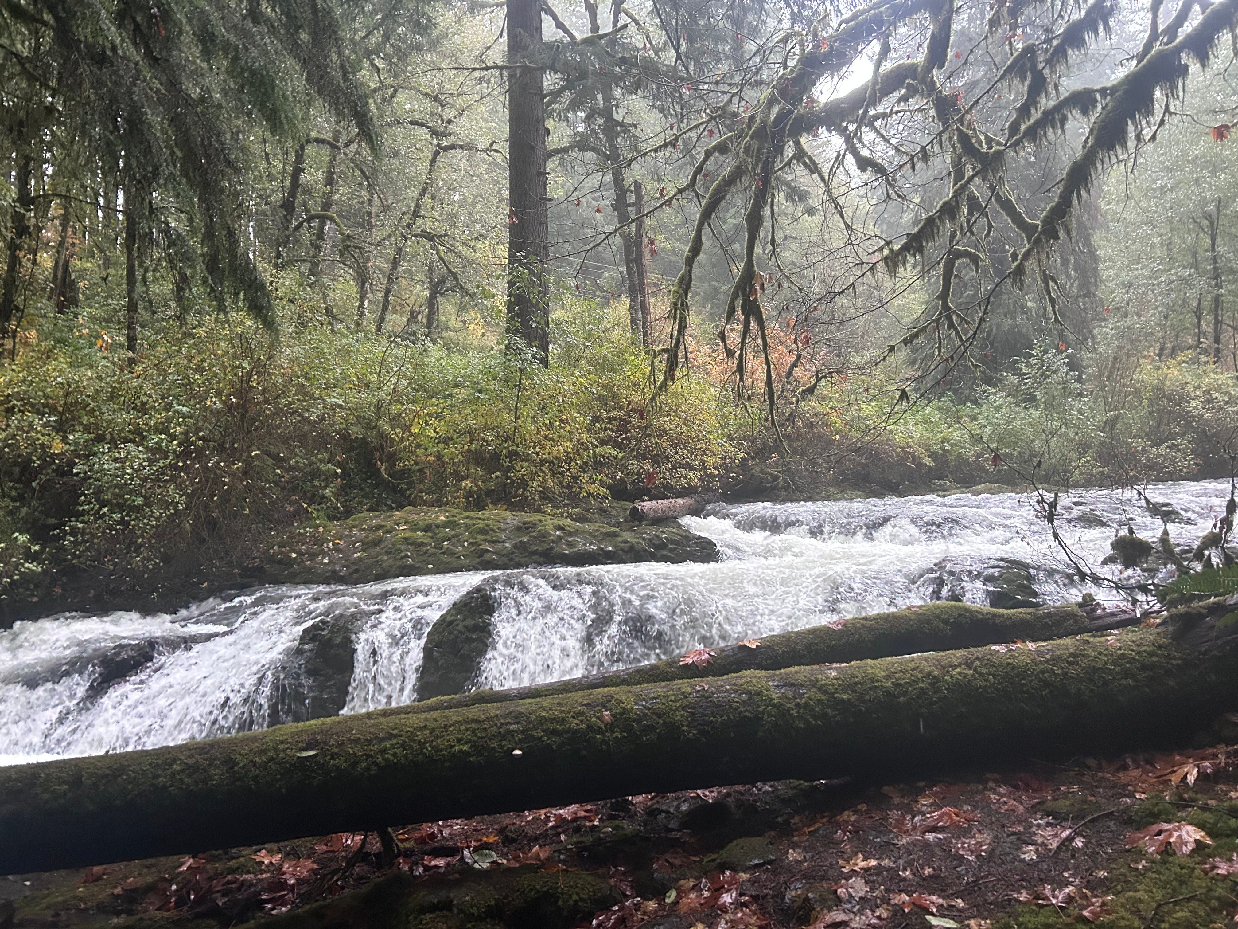OK so I start out at the beginning of the trail and it’s soaking wet. The rain is coming down a little ploppies, and the entire trail is covered with water. I’m not really too nervous about this other than the fact that I’m not gonna be able to run the trail and I’ll probably be Hugging the sides and brushing up against the trees which is also not terrible. My biggest concern is getting my shoes wet and my pants repelling the water. My coat is tried and tested but now put to chance. Well, my attire was a weak middle of the night decision so I’m now wondering if I should be starting to regret it. So I got out and I start hitting the trail. Looking for places to run and then finally. I settled into a fast run/ walk. There’s beauty everywhere here this is exactly what I needed and so I stopped without any sound. I just let this sound cover me the sound surrounding the sound of the rain hitting the top of my jacket sound of waterfall off in the distance, the sound of wind and small animals And puddles and little mini waterfalls all the sound of trees